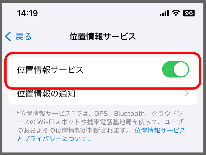 「設定」 > 「プライバシーとセキュリティ」> 「位置情報サービス」にて有効(オン)にしてください。