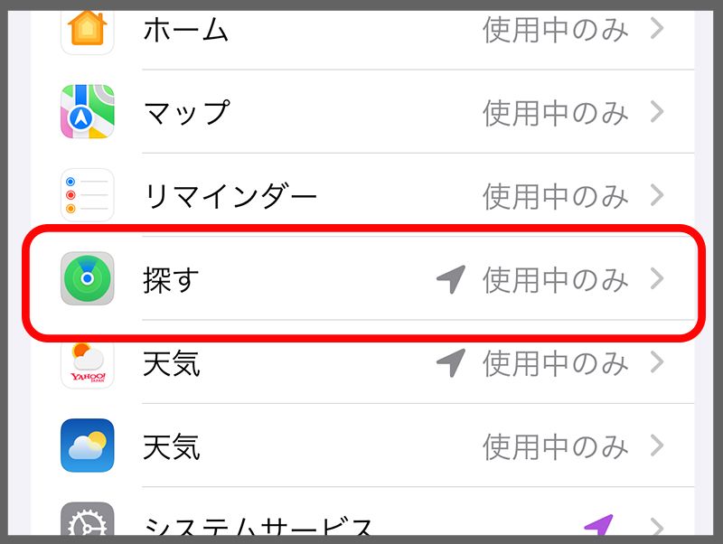 「設定」 > 「プライバシーとセキュリティ」>「位置情報サービス」の順に選択し、下にスクロールして「探す」をタップします。