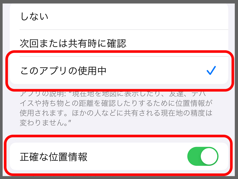 「このアプリの使用中」にチェックマークをつけて「正確な位置情報」を有効(オン)にしてください。